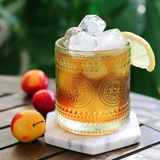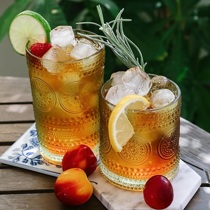 - Sweet tea glasses, Water glasses, iced coffee cup, juice cups, these are great for any cold drink from cocktails to mocktails and even beer! With a nice weight they feel great in your hand and look even better! The retro boho esthetic is sure to make all your guest where you got them from!