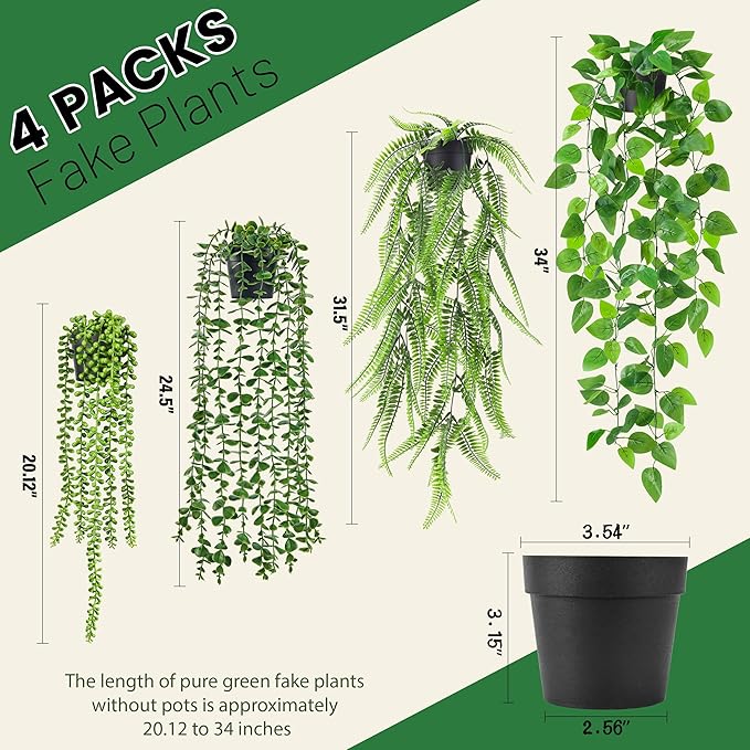 - Perfectly Sized: With 4 different styles of fake hanging plants with black pots. 24.5" for eucalyptus leaves, 20.12'' for string of pearls, 31.5'' for boston fern and 34''for fake pothos