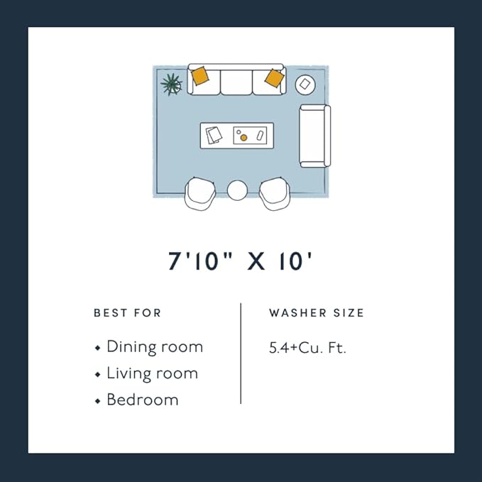 - WASHING GUIDE: For 8' x 10' we recommend a 100lb (13.5cu ft) commercial washing machine. Please call your local laundromat ahead of time to determine if the right washer size is available. When it's time for a deeper clean, machine wash your rug with like colors on delicate with 1 TBSP of gentle detergent. Preferably line dry. Alternatively, tumble dry on no or low heat setting.