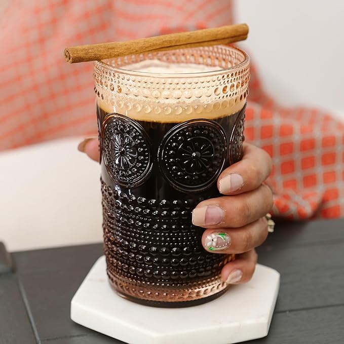 - Sweet tea glasses, Water glasses, iced coffee cup, juice cups, these are great for any cold drink from cocktails to mocktails and even beer! With a nice weight they feel great in your hand and look even better! The retro boho esthetic is sure to make all your guest where you got them from!