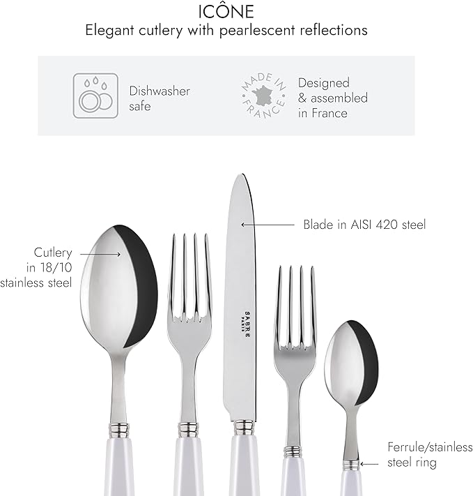 - ICÔNE COLLECTION: Introducing the Icône Collection, offering elegant cutlery with a distinctive touch. With its sleek lines and 21 colors featuring captivating mother-of-pearl reflections, you'll find the ideal silverware for your table.