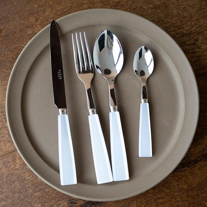 - STAINLESS STEEL FLATWARE: This set combines a beautiful play of premium materials with cutlery crafted from 18/10 stainless steel, boasting a brilliant finish, and acrylic handles. The knife blade is made of AISI 420 steel.