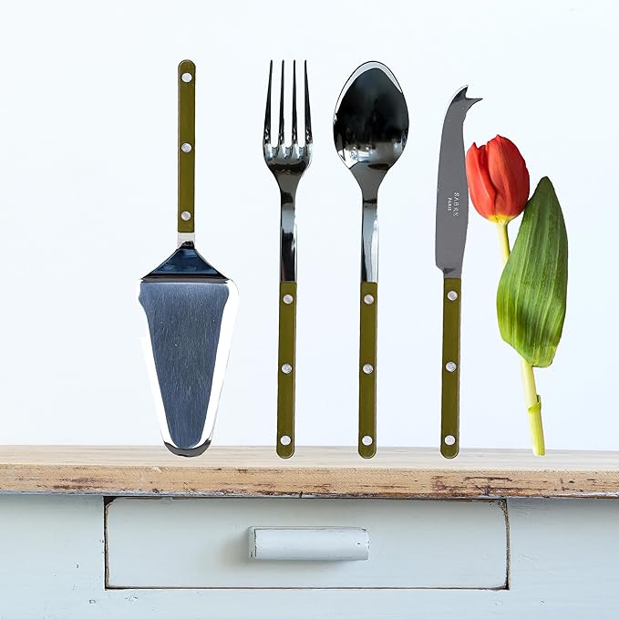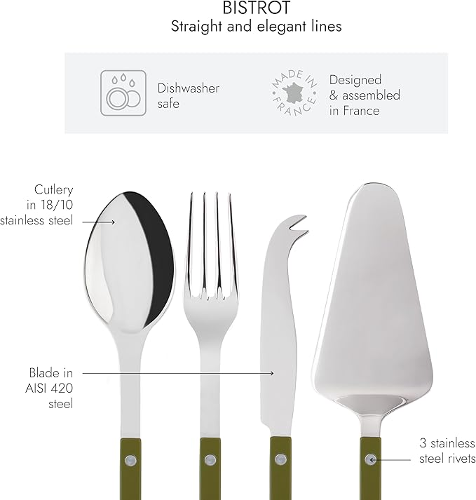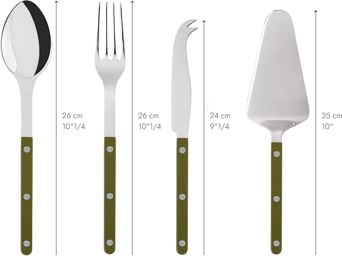 4-Piece Serving Set - Bistrot Collection - 2 Serving Flatware, Serrated Pie Server, Large Cheese Knife - Stainless Steel & Nylon - Dishwasher Safe - Fern Green - Brilliant Finish