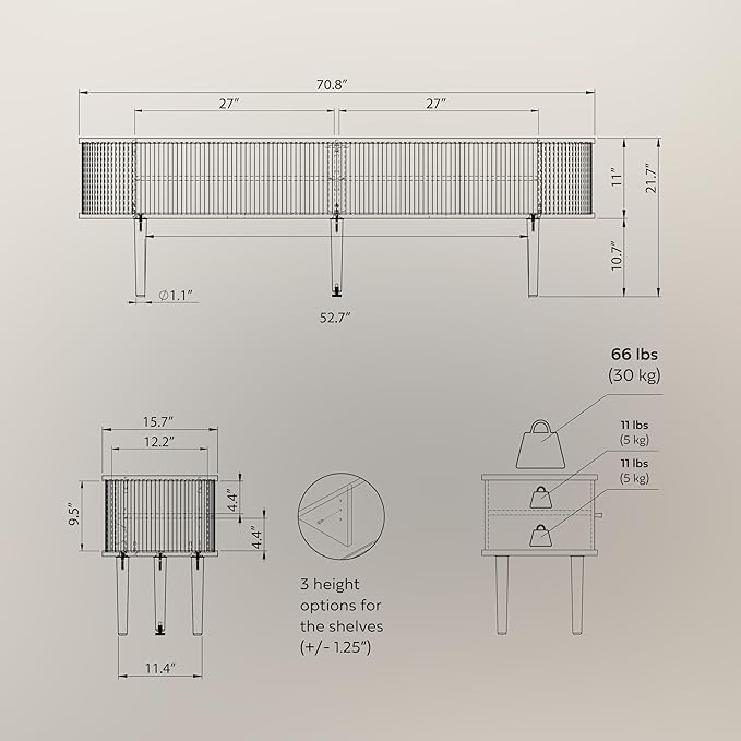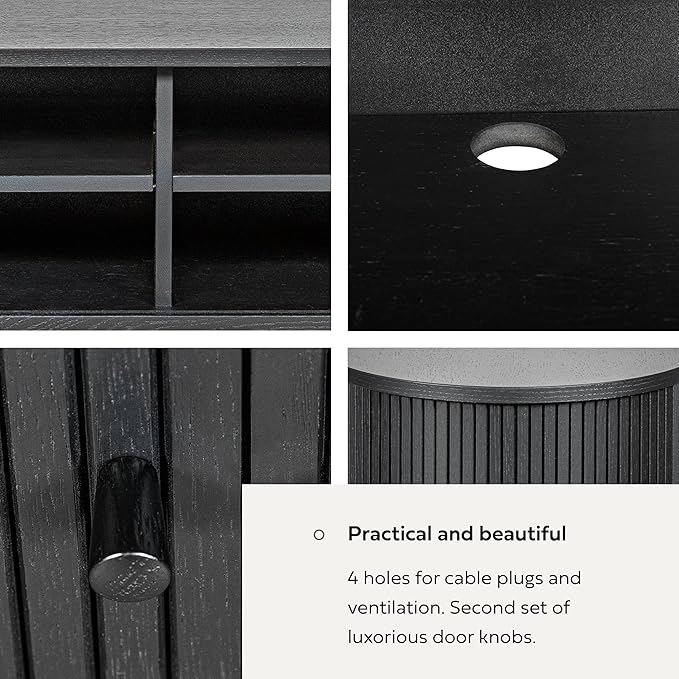 - ENJOY EFFORTLESS STORAGE as you can choose between 3 set heights for the adjustable shelf to maximize the use of the six storage spaces hidden behind the sliding doors. The fluted black TV stand cabinet (width 70,9 ‘’ x height 21,7’’ x depth 15.7’’) offers easy access to most frequently used cables, remotes, DVDs, video games and other accessories.