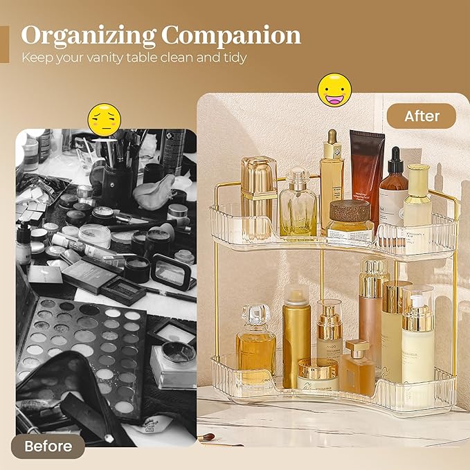 - đăSpace-Saving 90-degree DesignăElevate your space with our elegant 3-tier bathroom countertop makeup organizer. Featuring a smart 90-degree design, this corner vanity organizer maximaze your usually underutilized corner space. The perfume holder is versatile for not only bathroom but your kitchen, bedroom, or dresser. Bid farewell to cabinet chaos