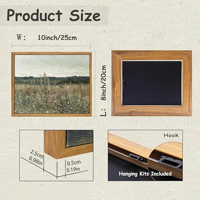 - 【Ready To Hang】Measuring 8x10Inch(20x25cm), this framed canvas art wall decor arrives ready to hang on the wall with hanging kits. (Before nailing the hook onto your wall, please refer to the installation instruction image provided. ) This vintage painting piece will bring a soothing effect to any room of your home with its calming colors. This antique landscape print is perfect for farmhouse style spaces, with a bold elegance that makes it an iconic centerpiece for you.