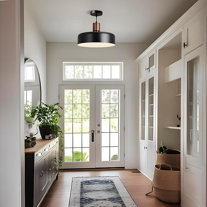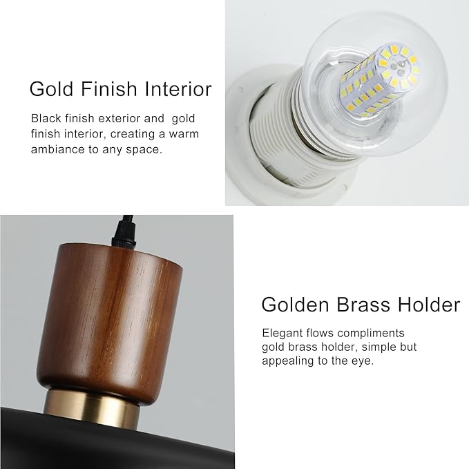 - This large ceiling hanging light features a sturdy hammered metal dome shade design, with a matte black finish exterior and interior white finish.The matte black lampshade is connected to a walnut solid wood post by a golden brass ring, creating a warm ambiance to any space.Our pendant lights have a classic Scandinavian style, simple but appealing to the eye.