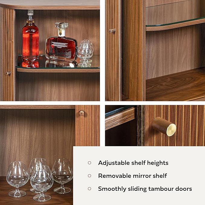 - SHOWCASE YOUR DRINKS IN STYLE by adding a dash of glamor to your drink presentation using the removable mirror shelf. The curvy corners and smoothly sliding tambour doors make it a great decorative liquor cabinet bar or a small coffee bar cabinet for kitchen, dining room, living room, or office. You will receive 2 sets of door knobs - wood & brass.