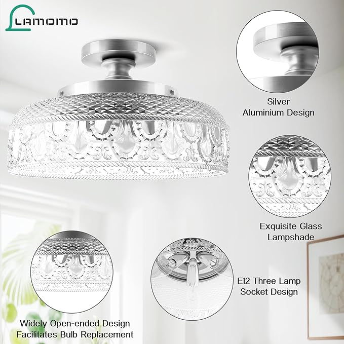 Lamomo Semi Flush Mount Ceiling Light,Upgraded Larger Silver Hallway Light Fixture,3-Bulb Globe Glass Close to Ceiling Scone, Indoor Hanging Light for Bedroom Kitchen Porch Hallway,Bulbs Not Included