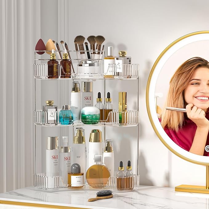 - 【3-Layer Large Capacity】3 tier beauty organizer is 10*10*17.5 inch, large capacity perfect size and enough height for high toiletries as tall as shower gel, shampoo or skincares, makeup remover. A stylish and practical gifts for makeup enthusiasts