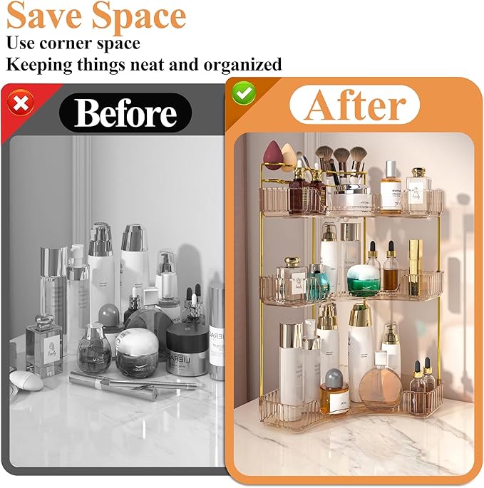 - Perfect Corner Makeup Organizer: This corner countertop organizer has a unique 90-degree corner design, prefect use usually underused corner space, saving your counter space so that your items are as organized as possible and within reach