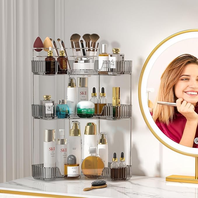 - 3 Layer Large Capacity: 3 tier beauty organizer is 10*10*17.5 inch, large capacity perfect size and enough height for high toiletries as tall as shower gel, shampoo or skincares, makeup remover. A stylish and practical gifts for makeup enthusiasts