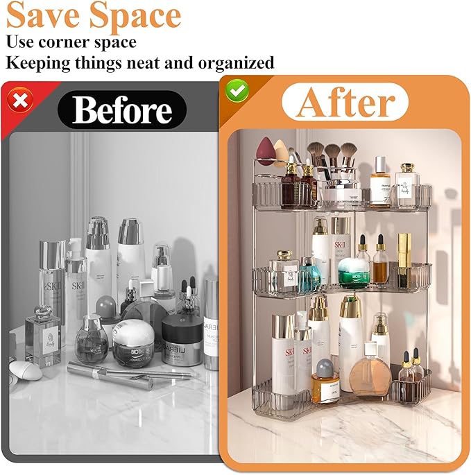 - Multipurpose Use: This corner makeup organizer can be used as a perfume holder organizer, bathroom organizer countertop, dresser organizer countertop, skincare storage organizer, makeup holder, lazy susan organizer, etc