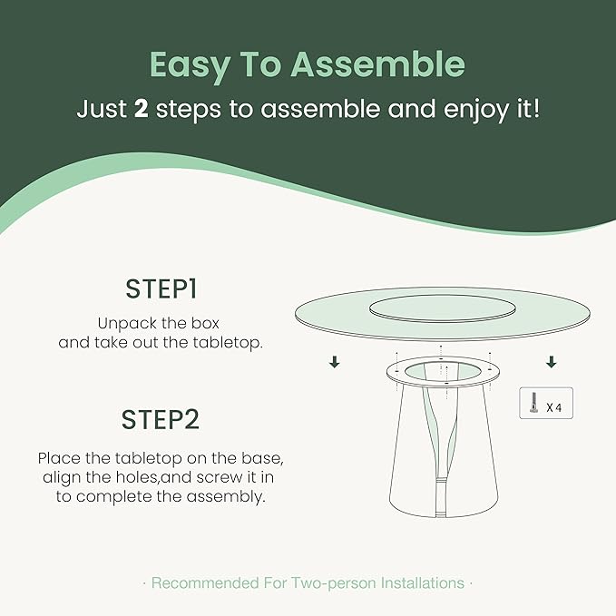 - Easy to assemble: The round dining table is easy to assemble. Just put the tabletop on the base and tighten it with screws to complete the installation. It is recommended that two people work together to complete the installation. The round dining table will be sent in two packages, and the time you receive each package may be different. If you have any questions, please keep in touch.(Product weight: 300 LBS, product size: 60"W x 60"D x 29.53"H;)
