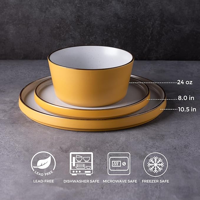- ELEGANT AND MODERN:Our dinnerware set are designed with two different glazes,the surface develops a white-grey color withe Speckled,and the egde and button cover with another beautifull color. This plates and bowls sets will make your table look more elegant and modern,making your food look even more delicious and happy every day for you,Perfect for housewarming, Thanksgiving, Christmas, and other fun celebrations.We are sure the items will Impress your guests by its unique and charming relief design.
