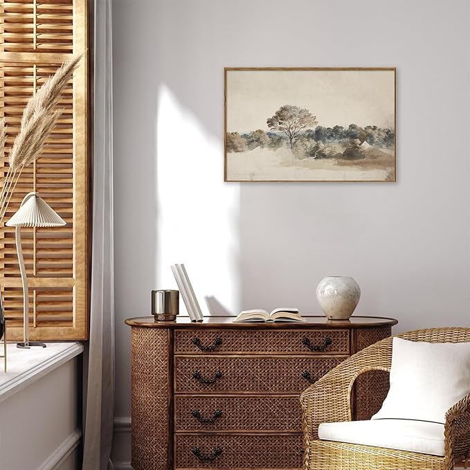KBKBART Framed Vintage Neutral Wall Art Prints, Antique Rustic Muted Landscape Canvas Painting, Retro Countryside Nature Wilderness Illustrations Farmhouse Decor, Neutral Vintage Decor Ready To Hang