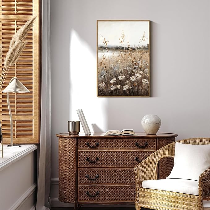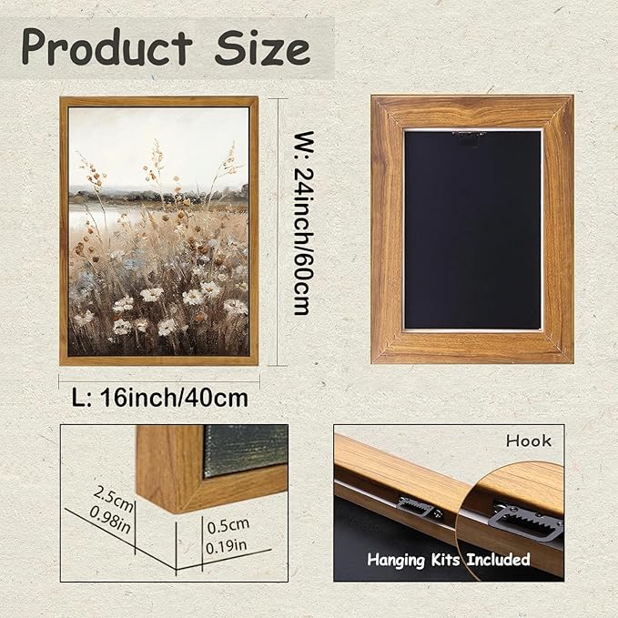 - 【Ready To Hang】Measuring 16x24Inch(40x60cm), this framed canvas art wall decor arrives ready to hang on the wall with hanging kits. (Before nailing the hook onto your wall, please refer to the installation instruction image provided. ) This vintage wildflowers meadow landscape art piece will bring a soothing effect to any room of your home with its calming colors. This antique landscape print is perfect for farmhouse style spaces with a bold elegance that makes it an iconic centerpiece for you.