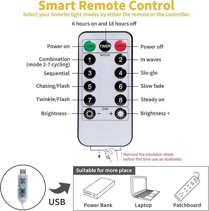 - USB Powered - Plug in with our USB charger, suitable for more places to get powered even in camping or barbecue. Or Powered by power bank, laptop, cellphone adapter and more.Start and enjoy the curtain lights anywhere you love