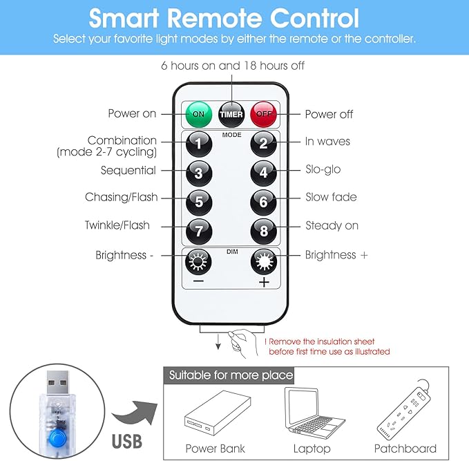 - ✨8 Modes & Memory Function - The string lights have 8 lighting modes: Combination, in waves, sequential, slogs, chasing, slow fade, twinkle, steady on. With a memory function, the mode that is turned on again after being turned off is that before turning off.