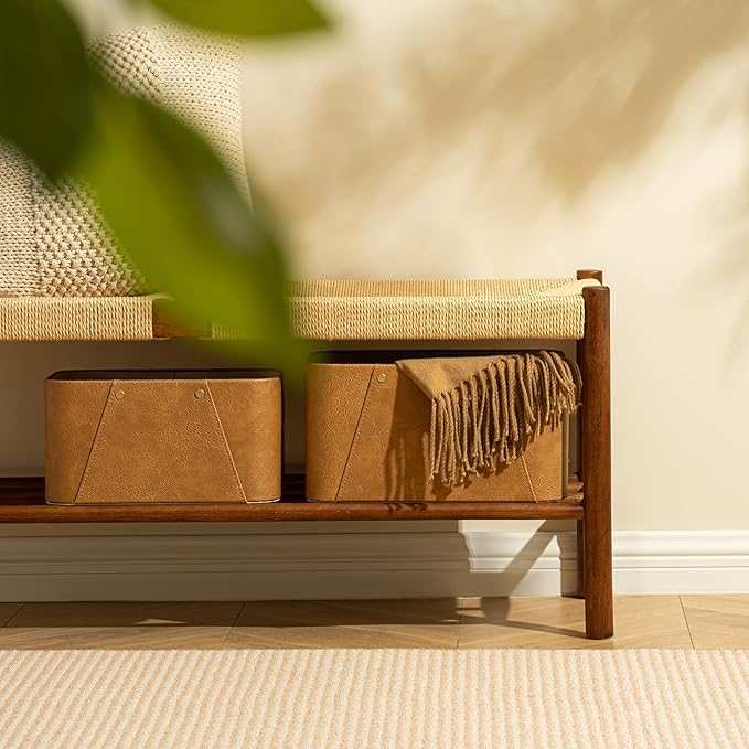 - LUXE VEGAN LEATHER STORAGE BIN - Elevate your space with our premium storage bin set, showcasing a sturdy rectangular MDF (medium-density fiberboard) base encased in elegant Camel vegan leather. Crafted for enduring strength and durability, this basket set effortlessly organizes books, magazines, and larger items such as pillows or blankets with style and grace.