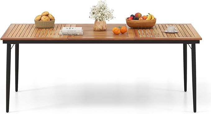 Tangkula Outdoor Dining Table for 8, 79 Inch Acacia Wood Patio Table with 1.9” Umbrella Hole, Metal Frame & Anti Slip Foot Pads, Indoor Bistro Table for Poolside, Garden & Deck