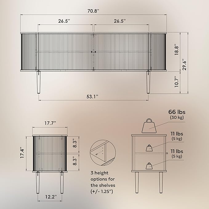 - ENJOY EFFORTLESS STORAGE as you can choose between 3 set heights for the adjustable shelf to maximize the use of the six storage spaces hidden behind the sliding doors. Fluted walnut dining room buffet cabinet (width 70.9 ‘’ x height 29.5’’ x depth 17.7’’) offers easy access to most frequently used tableware and serving utensils.