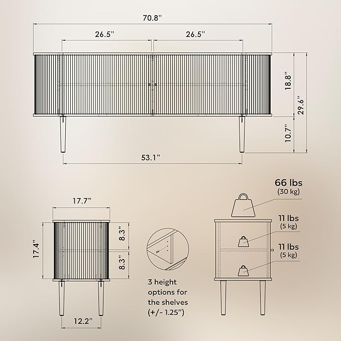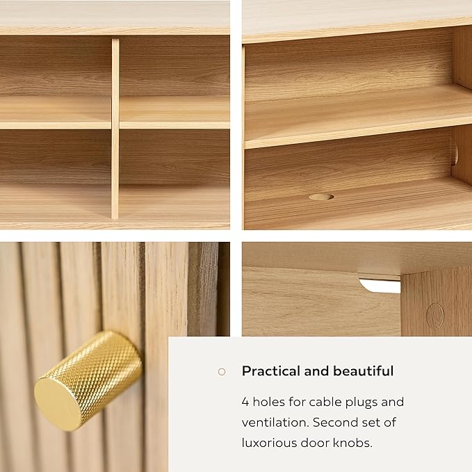 - ENJOY EFFORTLESS STORAGE as you can choose between 3 set heights for the adjustable shelf to maximize the use of the six storage spaces hidden behind the sliding doors. Fluted oak dining room buffet cabinet (width 70.9 ‘’ x height 29.5’’ x depth 17.7’’) offers easy access to most frequently used tableware and serving utensils.