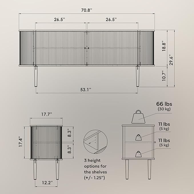 - ENJOY EFFORTLESS STORAGE as you can choose between 3 set heights for the adjustable shelf to maximize the use of the six storage spaces hidden behind the sliding doors. Black cabinet (width 70.9 ‘’ x height 29.5’’ x depth 17.7’’) offers easy access to most frequently used tableware and serving utensils.