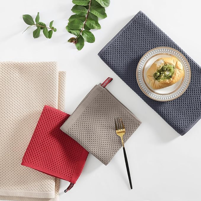 - VALUE PACK: The set includes 5-pack cotton dishcloths and 5-pack cotton dish towels, available in a variety of colors to coordinate with any kitchen décor. Measures 12 in x 12 in and 13 in x 28 in.