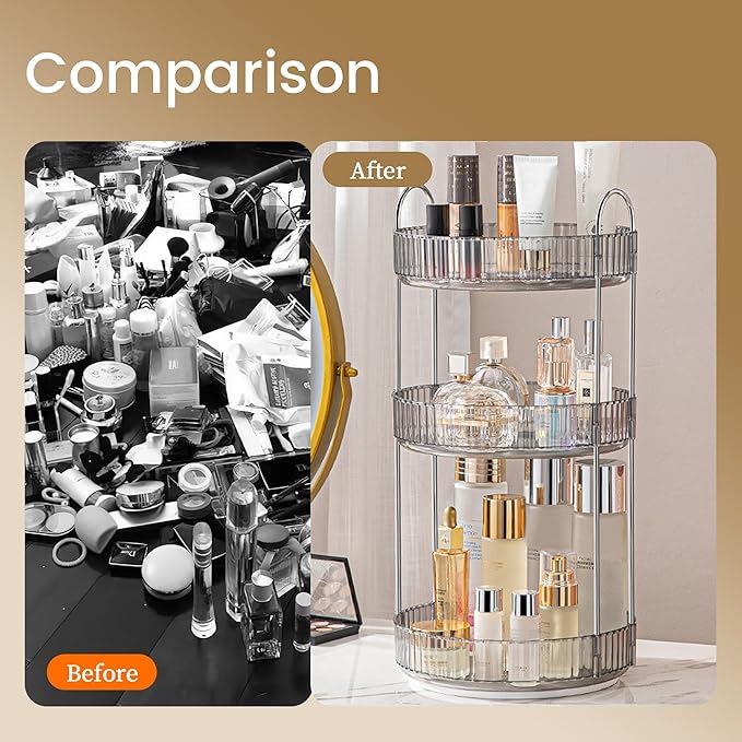 - đă360°Rotating DesignăUnlike conventional vanity makeup organizers, this innovative rotating organizer boasts a seamless 360-degree rotation capability. With just a gentle rotation, you can effortlessly access all your makeup essentials, making the selection process a breeze. The perfume organizer's high tray edge are thoughtfully designed to prevent any messy spills.
