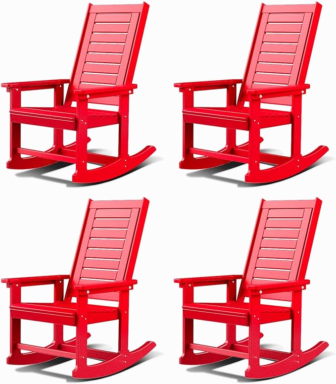 GREENVINES Outdoor Rocking Chairs | Set of 4 | Porch Rocker | HDPE Plastic | Red | Oversized Rockers | High Back | Big & Tall | Ladder Back | for Patio Outside Backyard Balcony Garden
