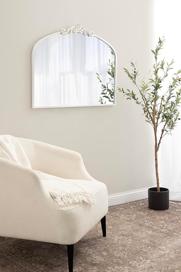 - Ornate Frame: This elegant wall mirror features an ornate, baroque-inspired frame with a trendy arched frame and an ornamental cascading garland crown