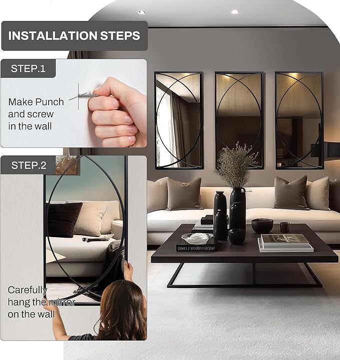 - High-quality materials: Our wall mounted mirror for living room and bedroom decor with the frame and loops are made of iron metal, and the mirror is made of quality glass with an MDF backing for security; a combination made to last