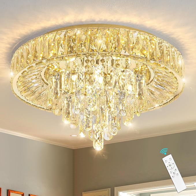 Modern Crystal Chandeliers for Dining Room LED Light Fixture Close to Ceiling Chandelier Flush Mount Ceiling Light Dimmable Lamp with Remote for Living Room Bedroom Hallway