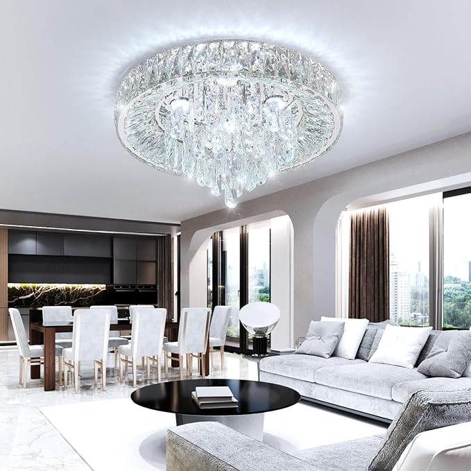 Modern Crystal Chandeliers for Dining Room LED Light Fixture Close to Ceiling Chandelier Flush Mount Ceiling Light Dimmable Lamp with Remote for Living Room Bedroom Hallway 2700K 6000K
