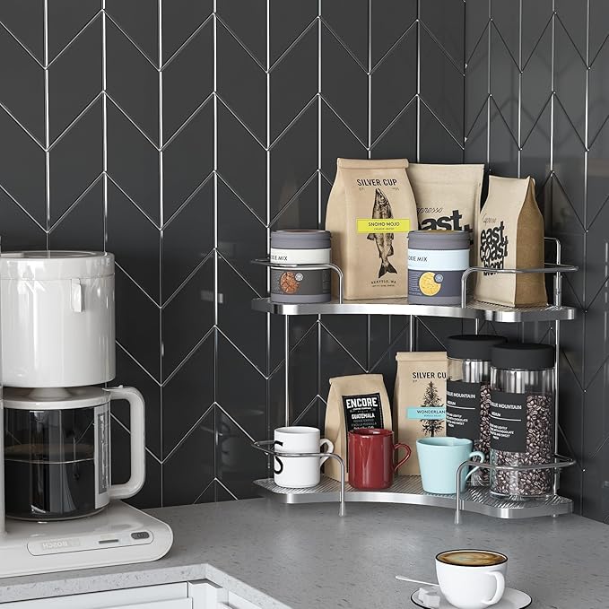 - 【Elegant Design,Truly Universal】The corner organizer has beautiful shine,color and attractive design.This isn’t limited to just bathroom use,could hold perfumes,makeups,jewelry on the dresser;could hold spices on pantry,kitchen countertop-options are endless.