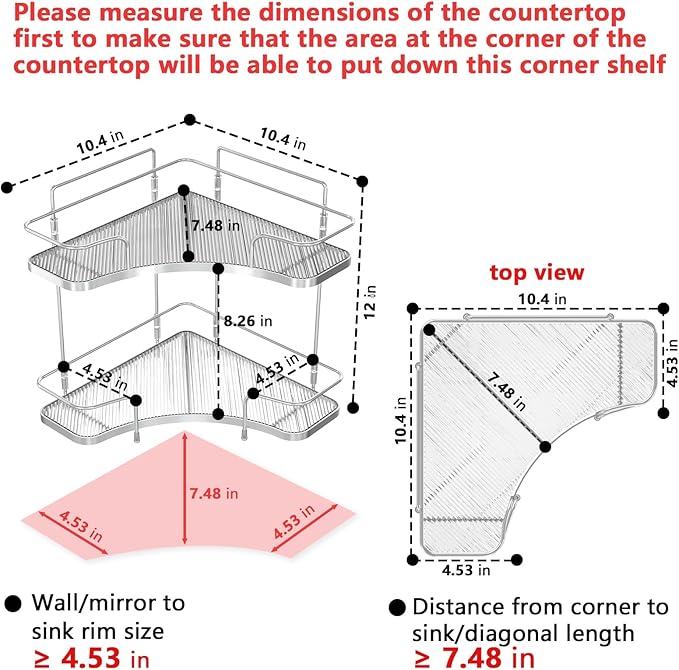 - 【Suitable Size】This 2 tier bathroom counter organizer is 10.4*10.4*12in,8.26in between the lower and the upper tray.The 90°ankle fits well with corners.Ideal for small space,multi users in x1 bathroom,dresser,pantry,kitchen,etc.