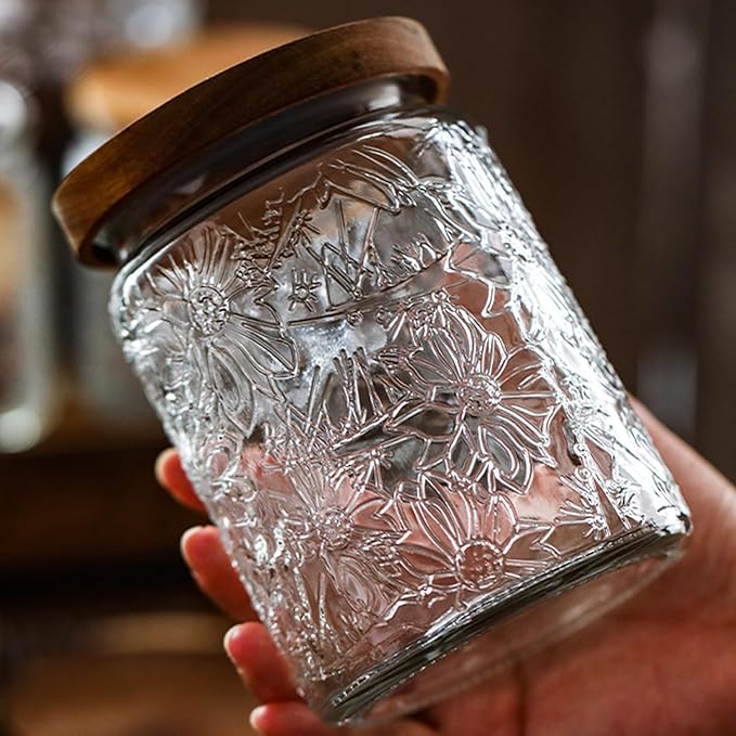 - Vintage Design: Daisy, Sunflower, Stars, Carved flowers, window carving, The glass jars with airtight lid have a vintage cameo inspired by nature and ancient cultures. The glass jars with airtight lid are inspired by nature and ancient cultures, and reflect the charm of light and shadow on the glass, which not only makes your kitchen neat, but also very elegant