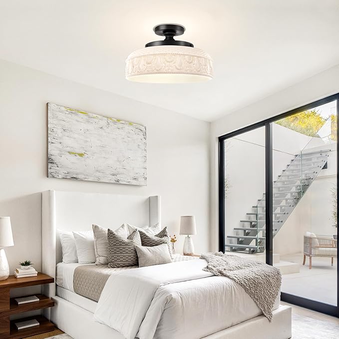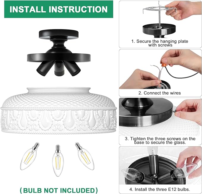 - 【3-Step Easy Installation】 With all mounting accessories included, it only takes you few minutes with clear 3-step guidance to complete this glass flush mount ceiling lamp. Surprisingly, we also prepared an extra spare mounting kit in case you need to replace this black ceiling light when necessary. Please do cut off the power before installation, professional electrician is recommended for safety concern