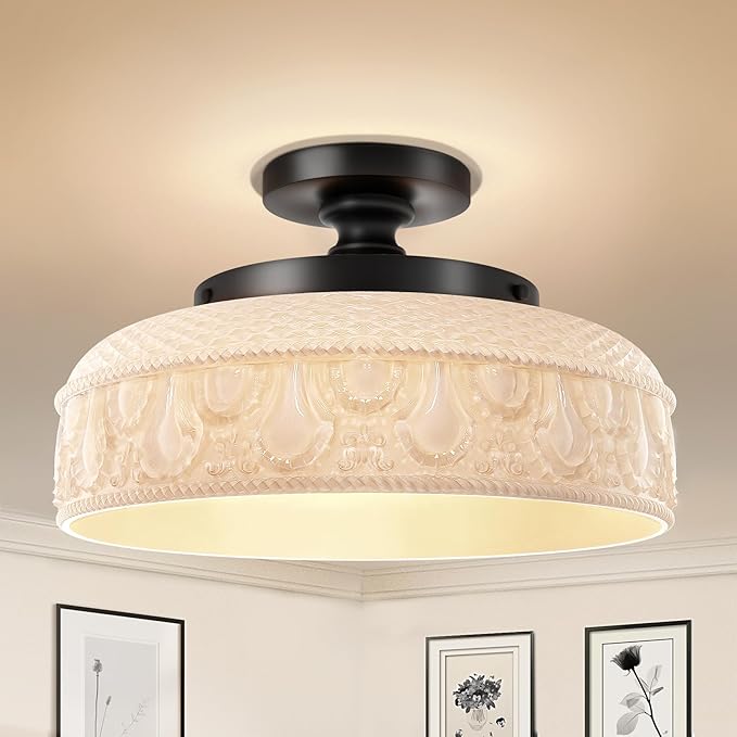 - 【Semi-Flush Design & Modern Look】 Vintage and modern lodge style industrial chandelier. Newly upgraded milky white glass shade is engraved with floral pattern and brushed nickel metal base can support the whole fixture firmly. Beautiful, safe and unique, this ceiling light fixture can create a romantic atmosphere for your home and is a great choice for decorating your house