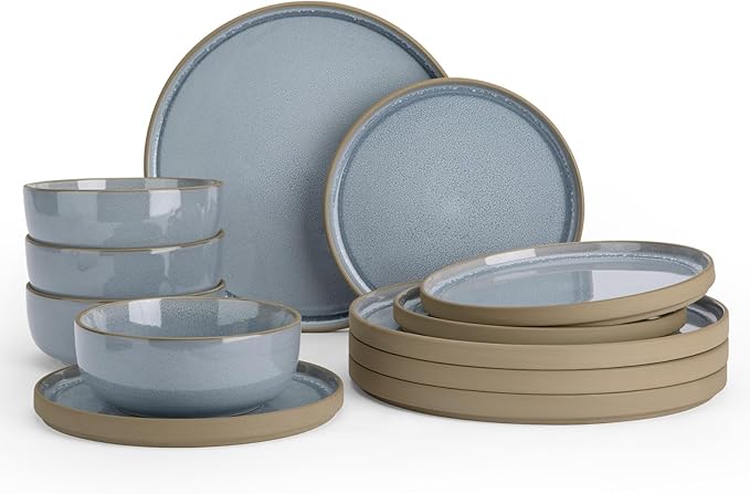 Famiware Nature Plates and Bowls Sets, 12 Pieces Stoneware Dinnerware Sets, Dishes Set for 4, Dishware Sets, Microwave and Dishwasher Safe, Light Blue