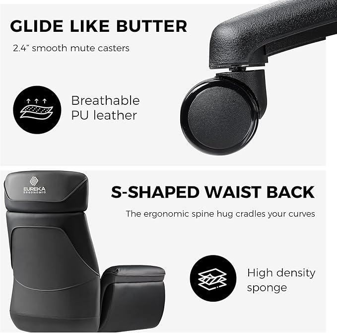 - 【Everlasting Focus on Ergonomic】- For over 20 YEARS, EUREKA has perfected ergonomic comfort. Our ergonomic desk chair tackles long work/gaming sessions causing back & neck strain. Home office chair features a height-adjustable headrest for neck support and an ergonomically contoured back that follows your spine. Combined with a full-covered dense foam cushion and durable home-office inspired frame, it delivers lasting comfort and support so you stay focused and avoid fatigue.
