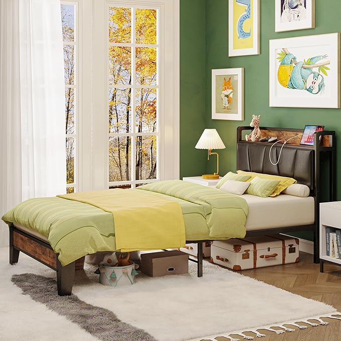 LIKIMIO Twin XL Bed Frames, Storage Headboard with Charging Station, Solid and Stable, Noise Free, No Box Spring Needed, Easy Assembly (Vintage and Black)