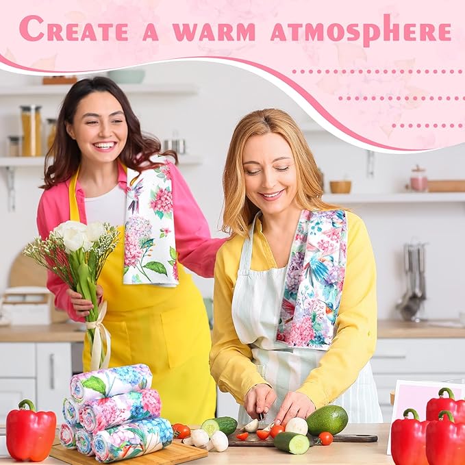 - Display of Diversity: experience the diverse range of exquisite designs in a pack of 6 summer kitchen towels; The pack delivers a rich blend of vivid hydrangea and hummingbird patterns suitable for your daily drying and cleaning kitchen chores; Bring color to your kitchen routines with these beautifully styled bird floral dish towels