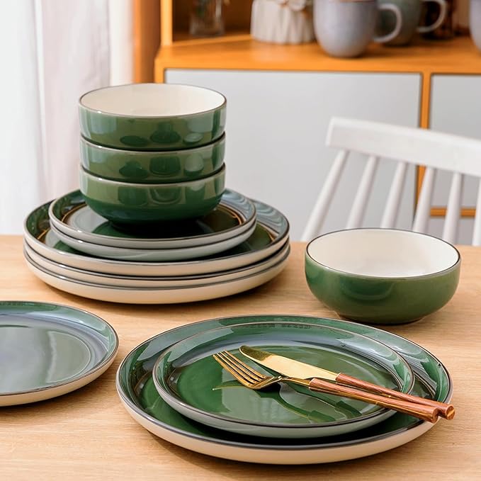 - 【MODERM DESIGN】Our ceramic dinnerware set features a distinctive double-color design, allowing your dinner plate and bowl to be the star of the table. The glaze is glossy with gradient color, and darkened rims, which look ultra classy and beautiful. This stoneware dinnerware set is durable enough for everyday use for the family, yet sophisticated enough for that important dinner party or special event.