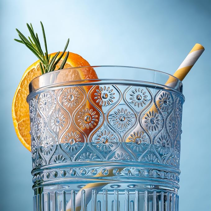 - Claro collection vintage romantic design crystal look-alike acrylic low drinking glasses are ideal for indoor or outdoor picnic and party use.