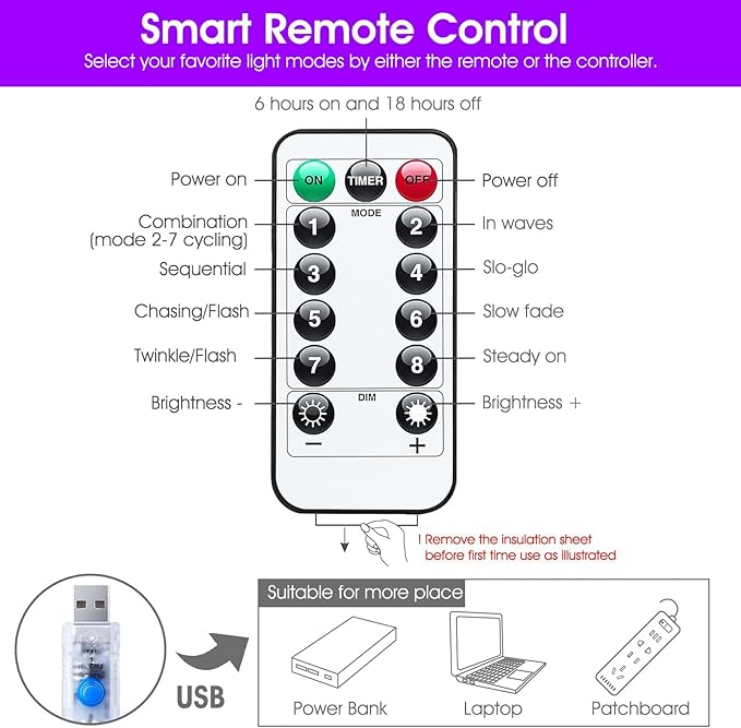 - [ 8 Modes & Memory Function ] - The string lights have 8 lighting modes: Combination, in waves, sequential, slogs, chasing, slow fade, twinkle, steady on. With a memory function, the mode that is turned on again after being turned off is that before turning off.