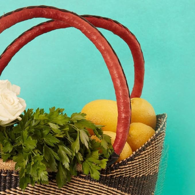 - AUTHENTIC DESIGN: Handcrafted African market basket from Ghana featuring traditional Bolga weaving patterns and genuine leather handles for durability