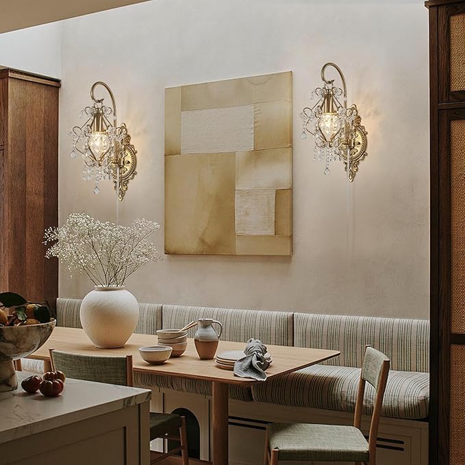 - 💡【High Quality Standard】High-grade K9 crystal with excellent appearance and transparency. The iron body of this crystal wall sconce is meticulously crafted using a copper plating process, boasting a brass color and brass-like properties. It is corrosion-resistant, with long-lasting color, and its quality far surpasses that of spray-painted products. This vintage wall sconce can withstand at least fifteen years of use.