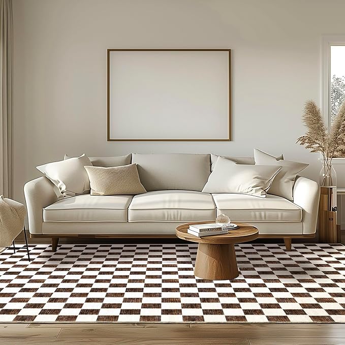 EVERGRACE Checkered Plaid Area Rug 8x10, Soft Fuzzy Faux Wool Rugs Washable Anti Slip Rugs Large Rug Carpet for Entryway Bedroom Living Room Hallway Kitchen Dining Room and Laundry Room, Dark Brown